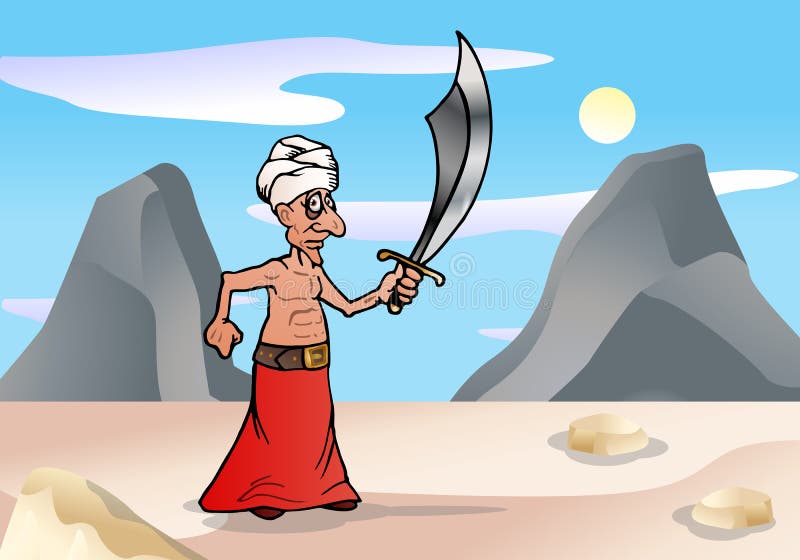Łowca ludzi. Ilustracja muskularnego mężczyzny w arabskim stroju z dużym mieczem na tle natury