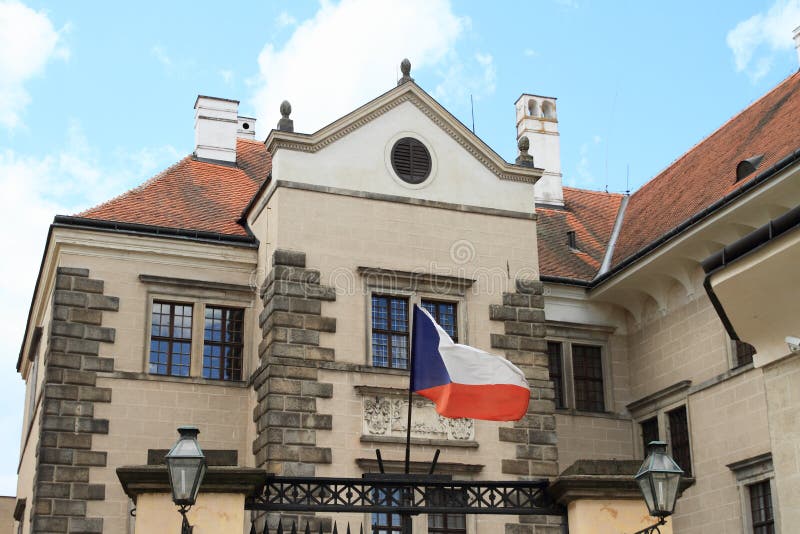 Czeska flaga w Zamku w Telczy. Czeska flaga powiewająca na wietrze na bramie zamku w Telczy (Czechy)